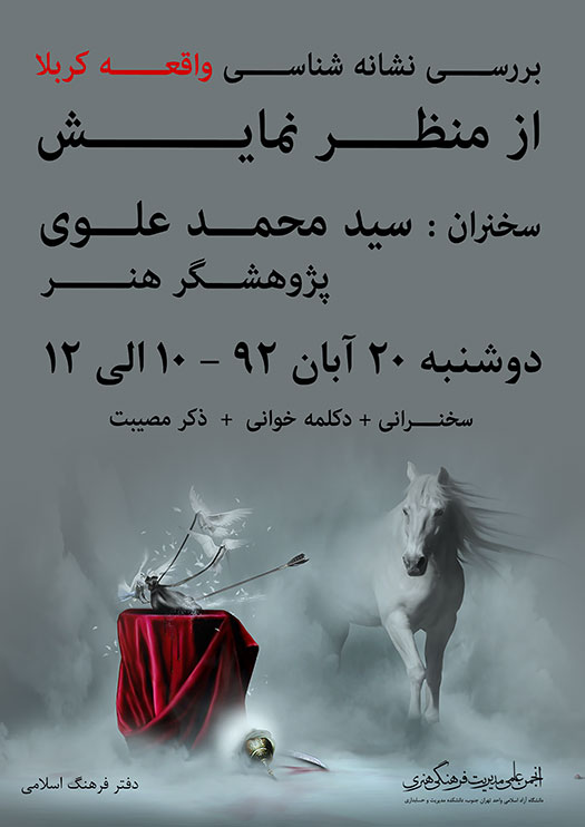 1. برگزاری سمیناری با عنوان " بررسی نشانه شناسی واقعه ی کربلا از منظر نمایش " با سخنرانی دکتر سید محمد علوی پژوهشگر هنر در 20 آبان ماه / که بسیار جالب و جذاب بود به خاطر نگاه نویی که به کربلا شد.
